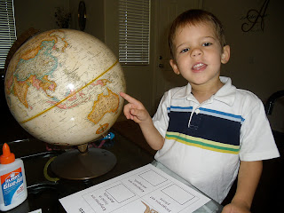 We learned where kangaroos live - Australia. And yes, I do know that he is pointing to the ocean. There were several other pictures of him actually pointing to the continent, but the smile wasn't as good. I went with a good smile. We learned what kangaroos eat and that they are marsupials. We also talked about what other animals are marsupials. I was even able to find a short video online about kangaroos. The kids' favorite one was of two male kangaroos having this horrific fight. I have to admit, they do have impressive kicks.